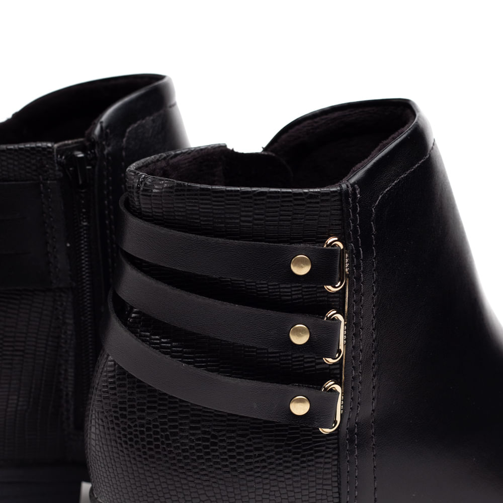 Confeccionada em napa, a bota possui recorte texturizado na parte traseira e tiras com detalhe em metal dourado, que agregam sofisticação ao modelo. O fechamento em zíper garante facilidade ao calçar, enquanto o forro têxtil acolchoado oferece maciez e proteção térmica nos dias mais frios.